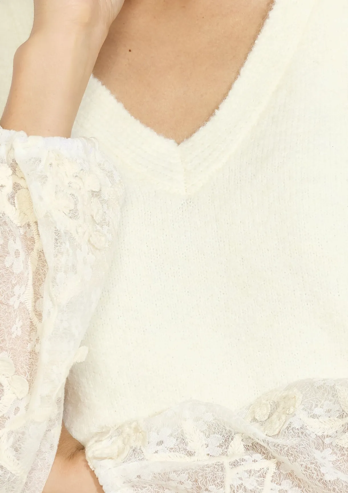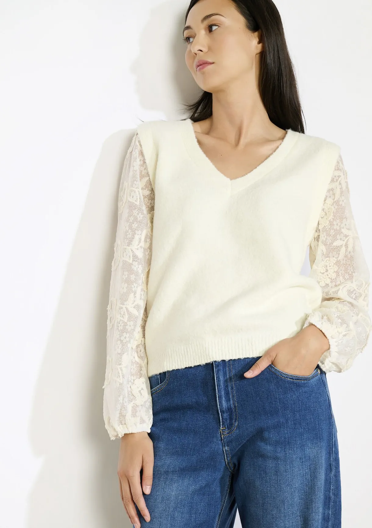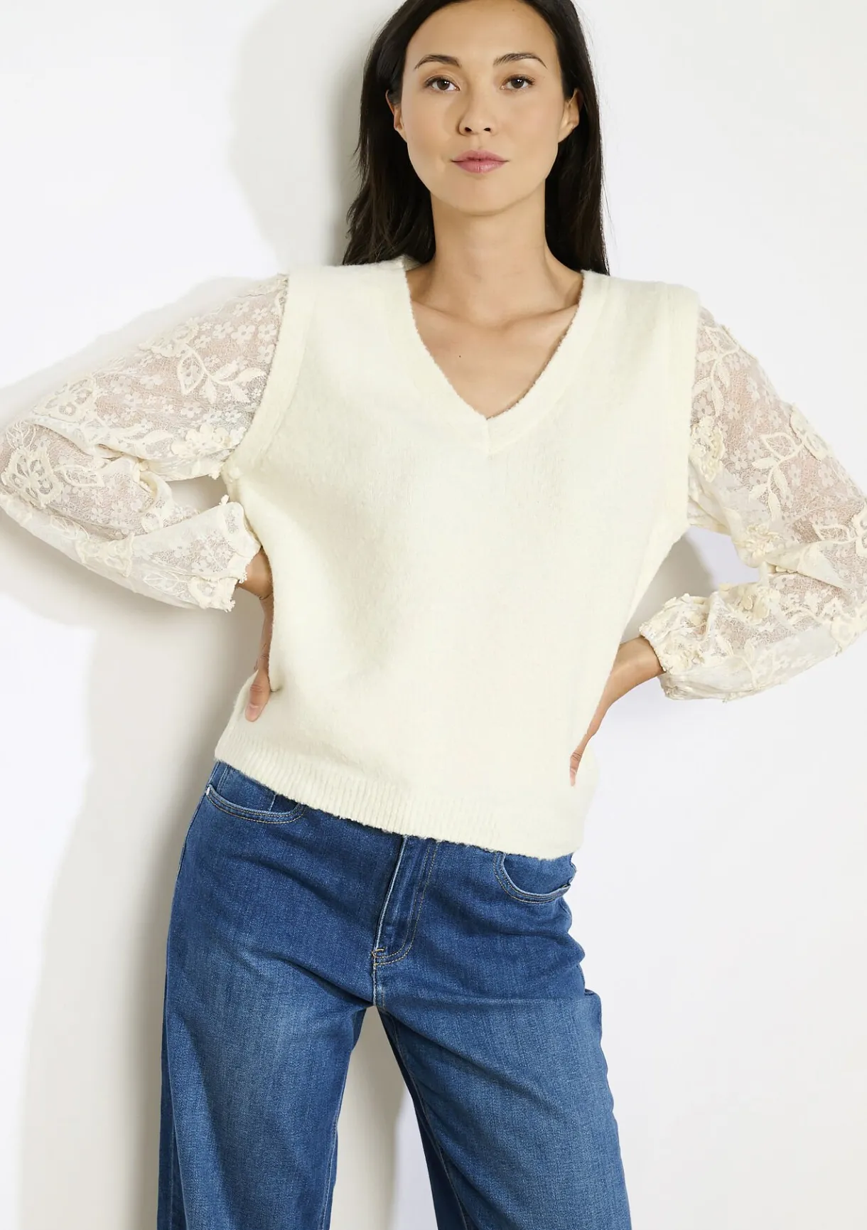 Deze V-hals trui straalt zachtheid uit met zijn fijne kanten mouwen. Elegant en vrouwelijk.