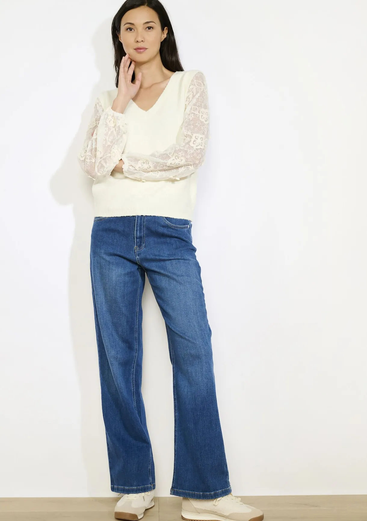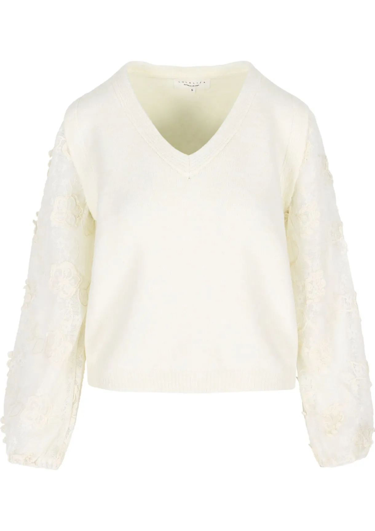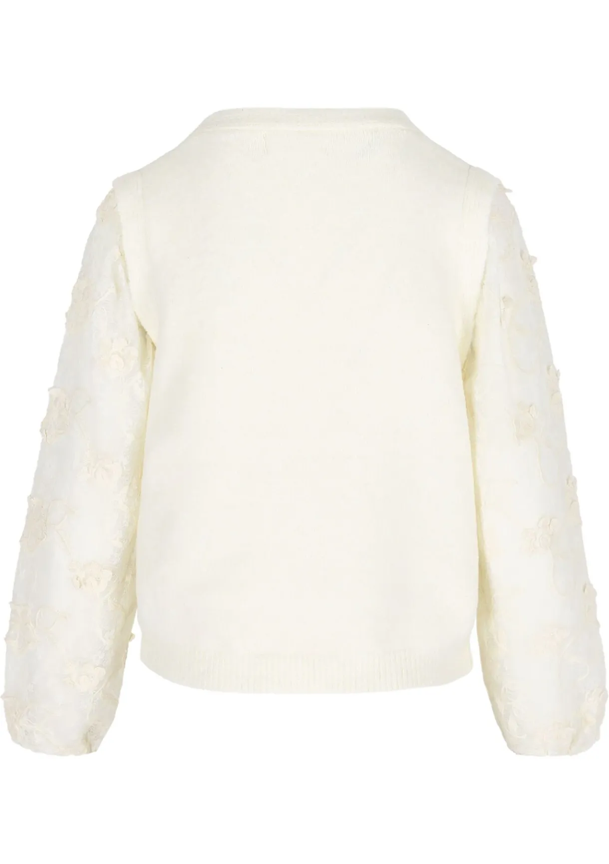 Deze V-hals trui straalt zachtheid uit met zijn fijne kanten mouwen. Elegant en vrouwelijk.