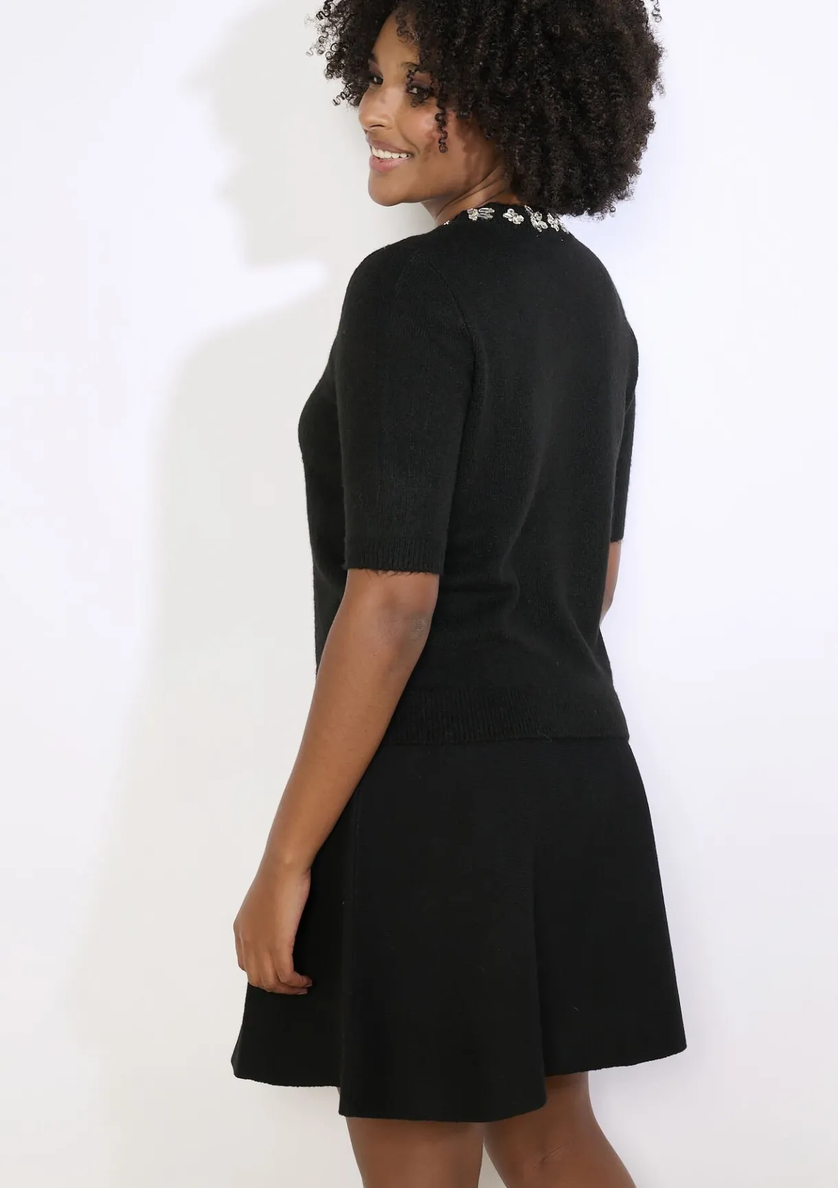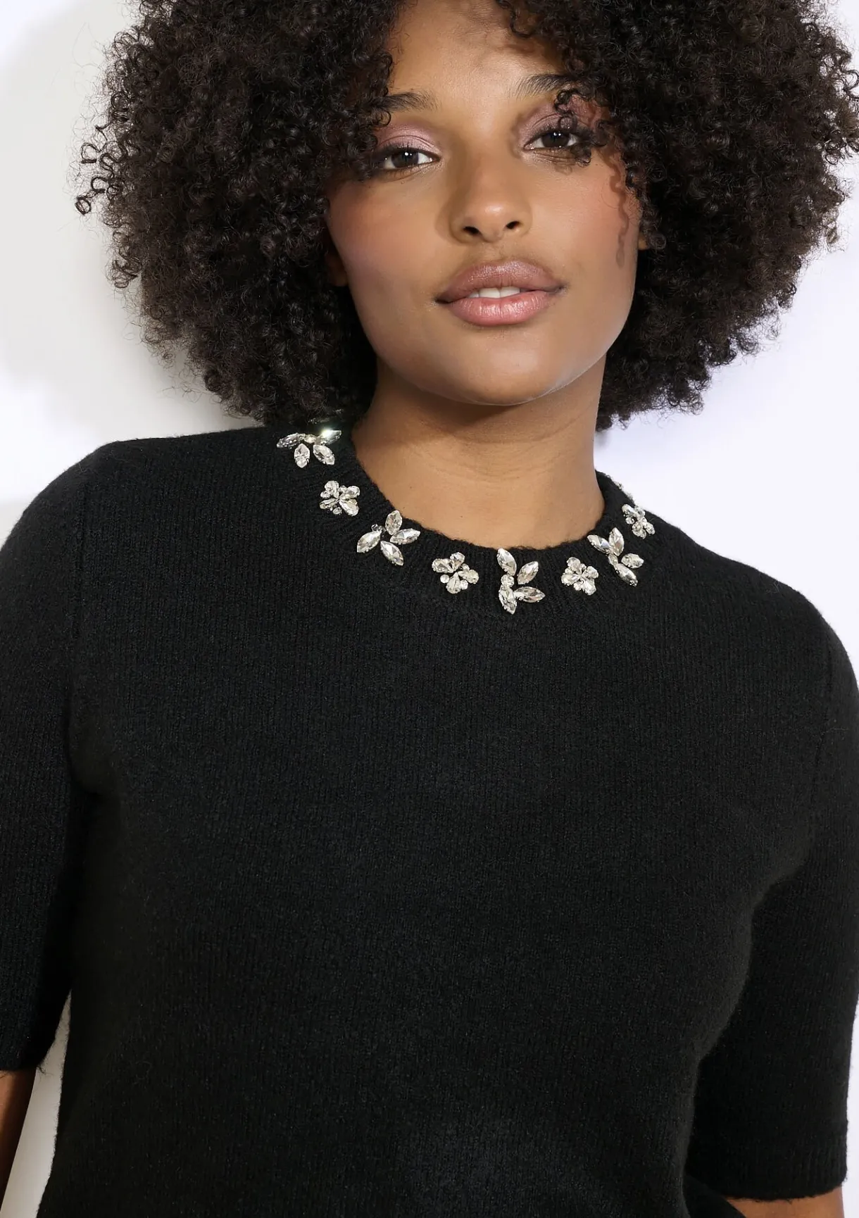 Met korte mouwen en een kraagje met sierstenen: deze trui voegt een geraffineerde toets toe aan je dagelijkse stijl.