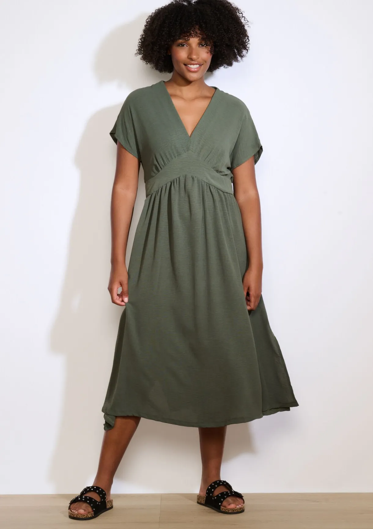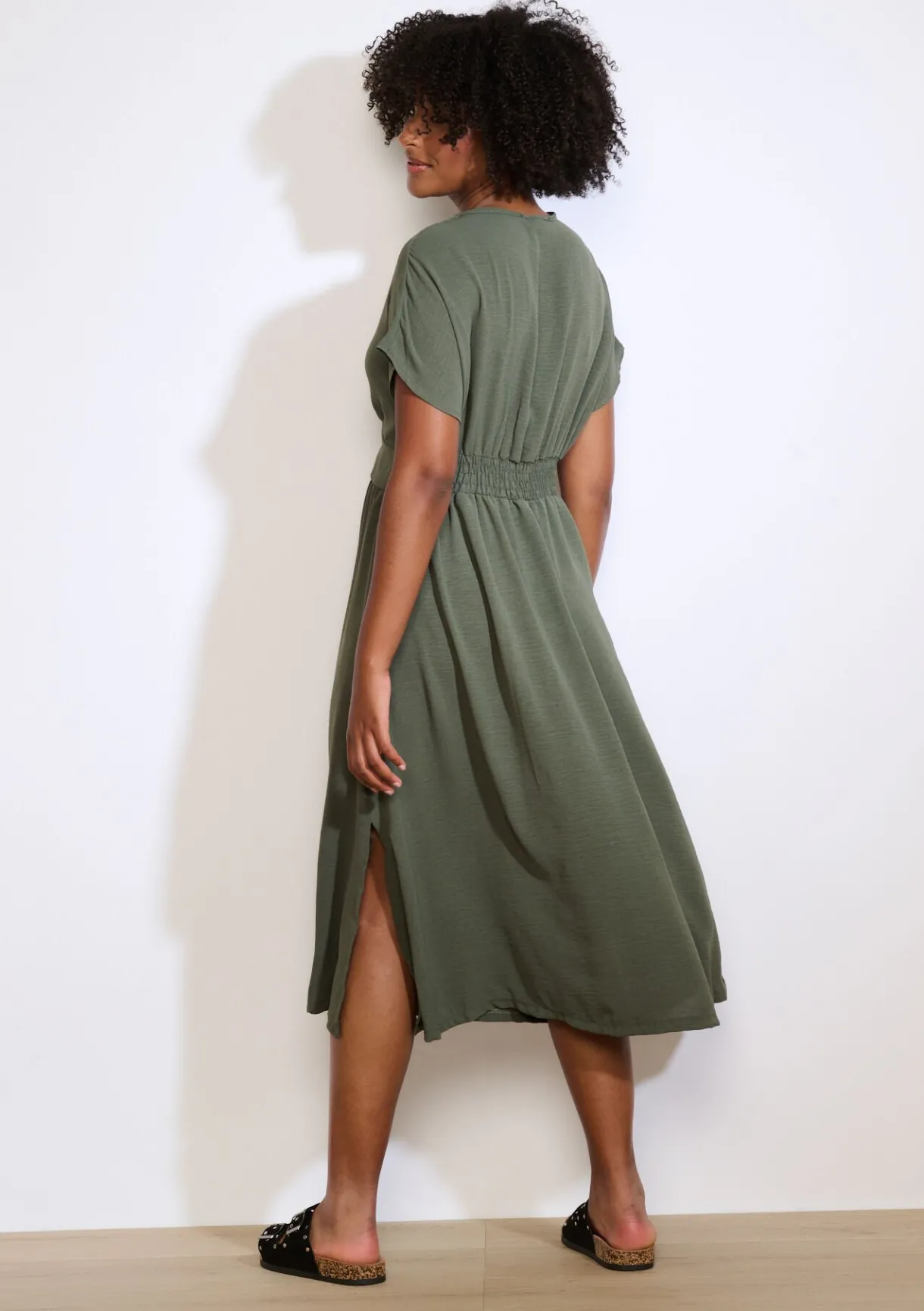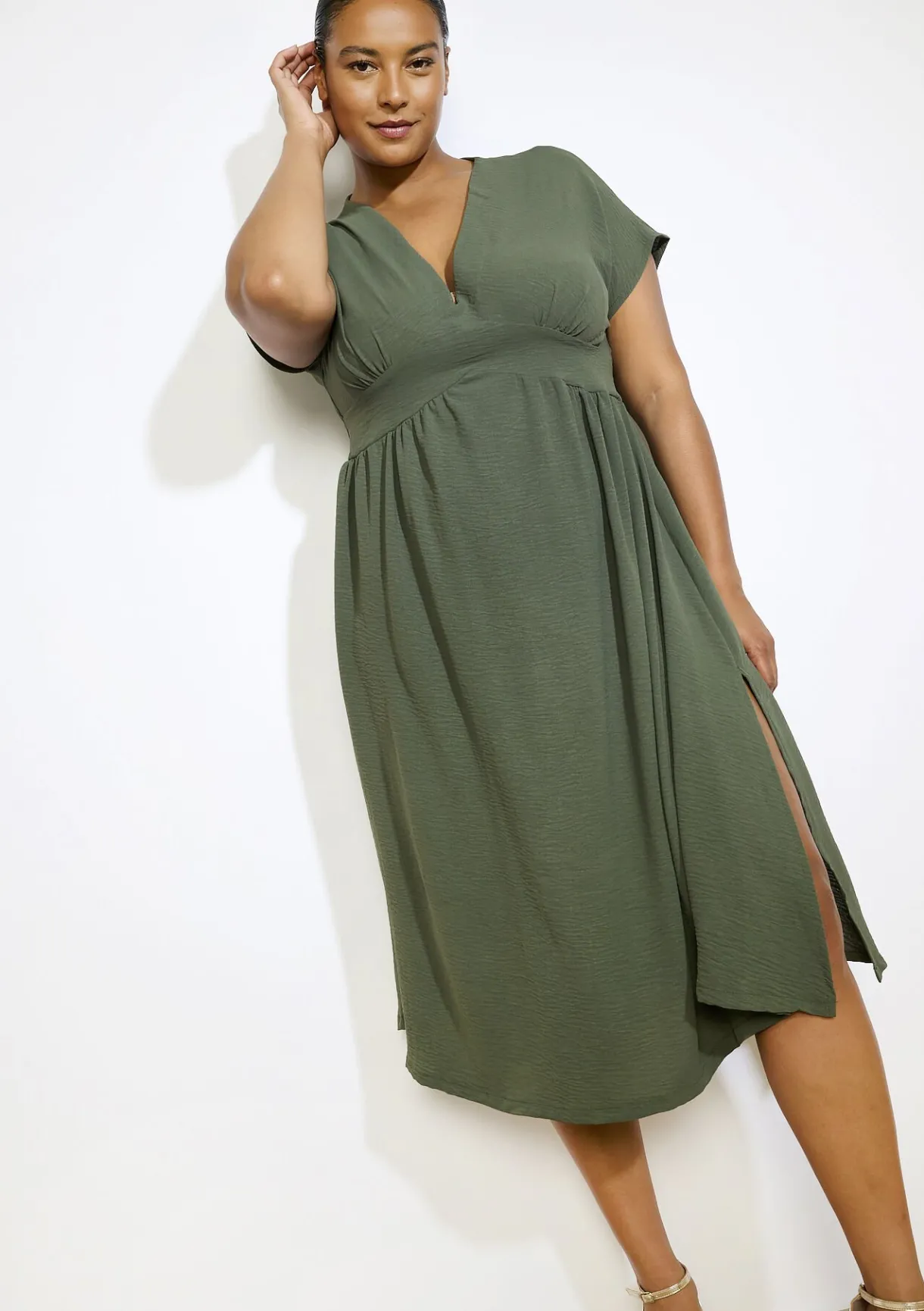 Een zwierige midi-jurk met empire taille en splitjes, perfect voor een elegante, moeiteloze uitstraling.