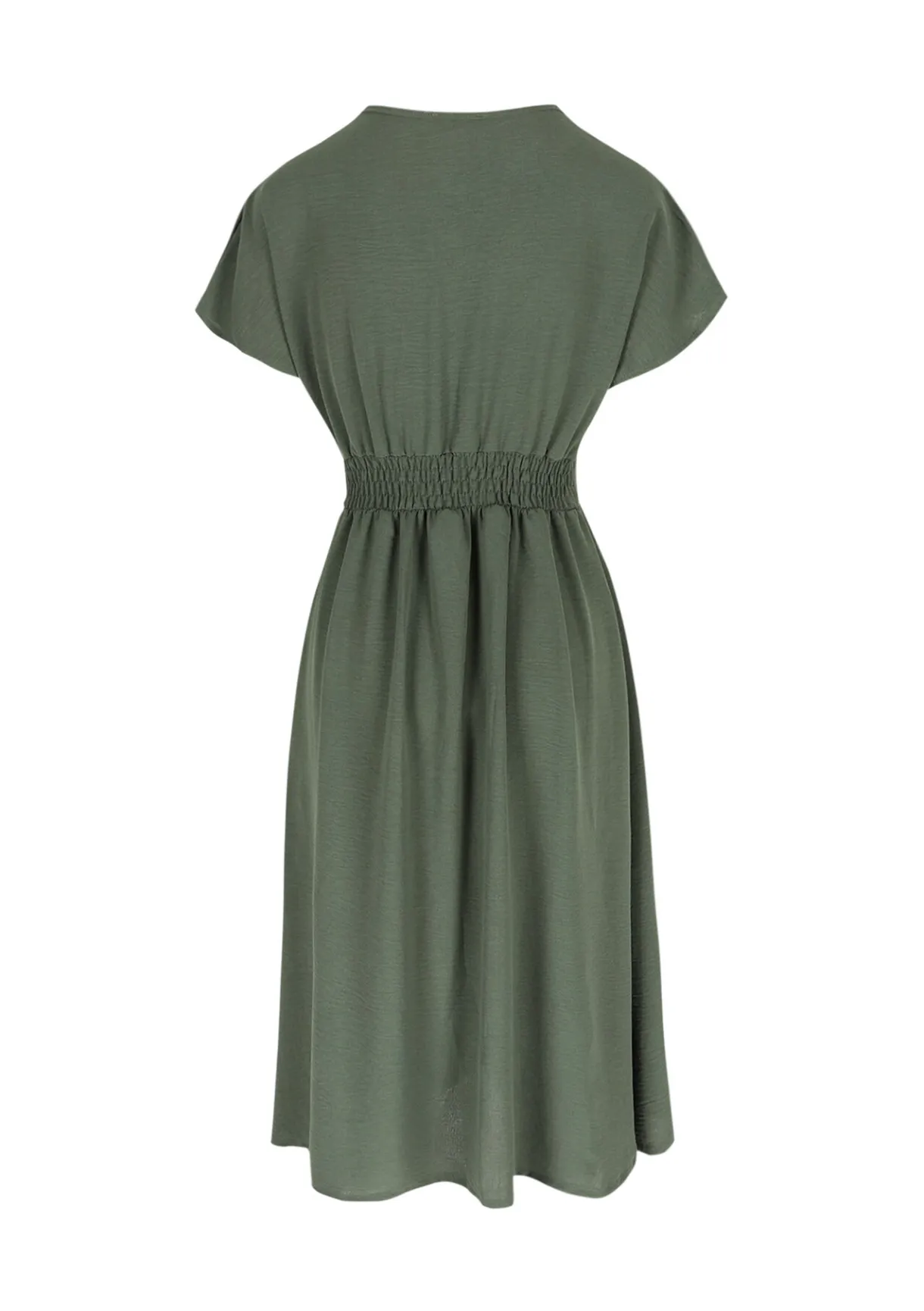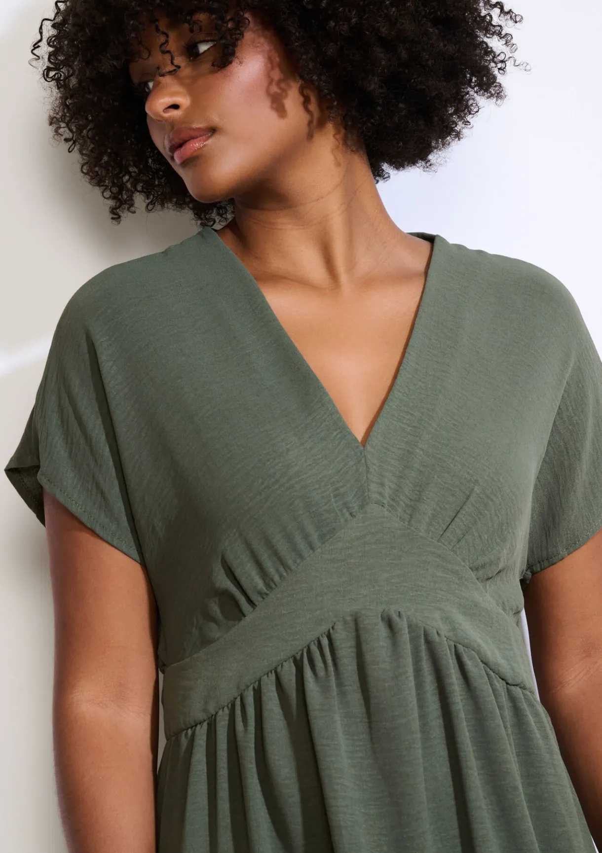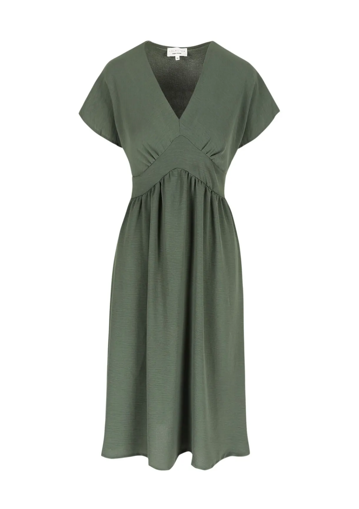 Een zwierige midi-jurk met empire taille en splitjes, perfect voor een elegante, moeiteloze uitstraling.